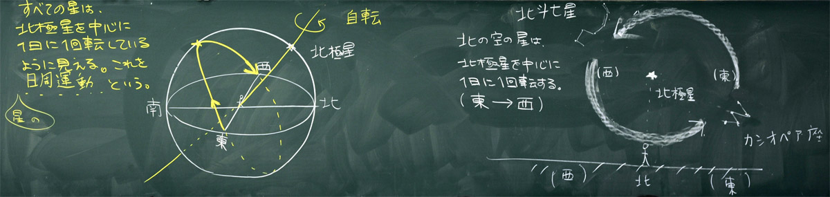 上:板書。初めに、左図で天体の日周運動をまとめる。次に、右図で北天の日周運動をまとめる。