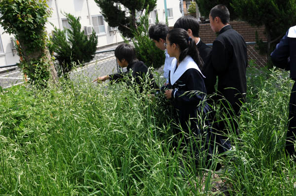 上:下駄箱の裏の空き地でノゲイヌムギの花を探す生徒(2012年5月7日)