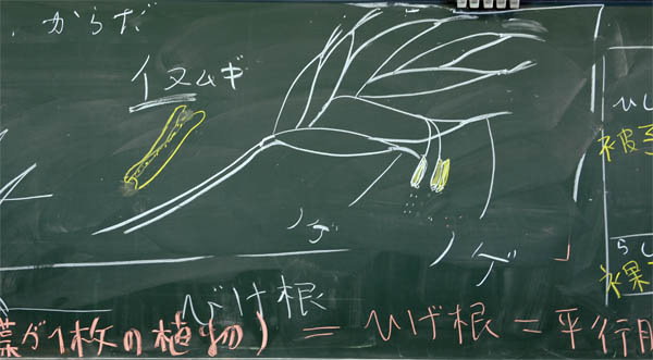 必ず押さえることは、単子葉植物=平行脈=ひげ根、以上です。数分間で終了する内容です。事前に内容を黒板に書いておき、生徒の実習の様子を見てタイミング良く確認してください。
