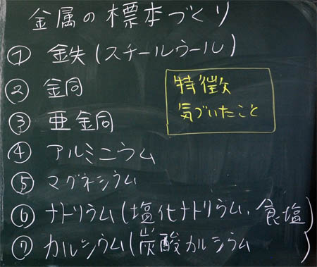 「次に、金属標本をつくりましょう。先生が7種類用意しましたので、それらをプリントに添付し、気づいたことをまとめましょう。本当は、加熱したり電流を流したりすると面白いのですが、時間が足りないので、今日はこのままの状態で見たり触ったりして気づいたことをまとめなさい。」