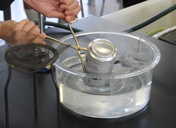空き缶つぶしの実験は盛り上がります。手際のよい班は、次から次へと5、6個つぶします。実験で使うアルミ缶やペットボトルは、各自で持参、実験後はお持ち帰りです。つぶれた缶を家族でみんなで鑑賞し、楽しい一時を過ごしてもらいましょう。関連ページ