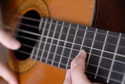 ギターの弦の数は6本が基本。弦は太さ・素材・質量などが違うが、弦の長さは全て同じになるので、演奏の前にその張力を調節して「ミ・ラ・レ・ソ・シ・ミ」になるように調弦する。次に、指で弦を弾くことによって振動させるが、その振動はブリッジ(駒)を通して表板やギター全体に伝わって増幅され、中央の穴「サウンドホール」から音として空気中に出る。