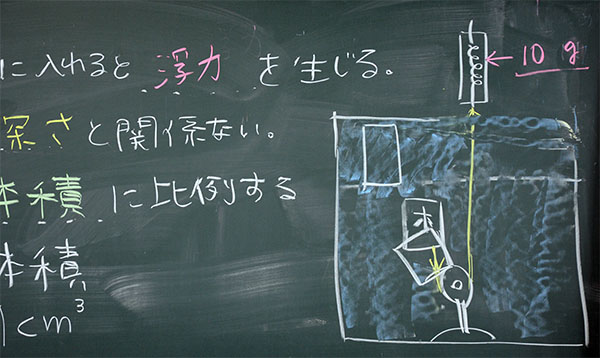 水圧を理解できた生徒にとって、浮力はそれほど難しいものではありません。本時は、水による浮力を矢印によって理解した後、浮力=体積の検証実験を行います。その授業展開は、4年前の記録『実験20浮力の大きさ(アルキメデスの原理)1年(2012年)』がよくできているので、そちらをご覧ください。本ページに掲載しているものは、本年度の記録図1〜図8だけです。