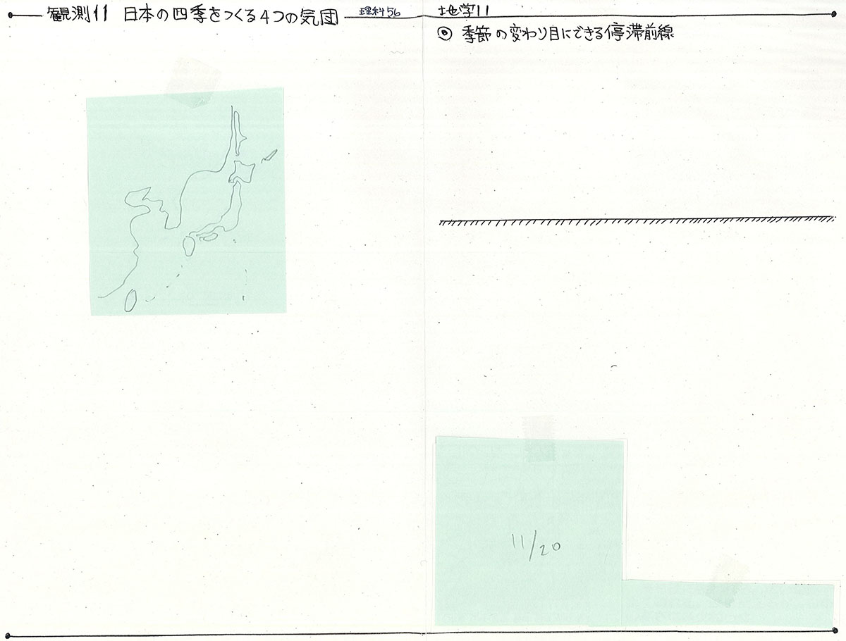 4つの気団による四季の変化は、簡単でわかりやすい内容です。授業後半の停滞前線は、前線面と前線について立体的にイメージさせることがポイントです。前線面に沿って、雲が傾いた屋根ようにつらなっている様子をイメージさせてください。なお、11/28から始まる期末テスト範囲はこのページの学習内容までです。次の時間からしばらく、これまでの復習やテスト返却などがあり、次回授業記録は12/1(金)になります。