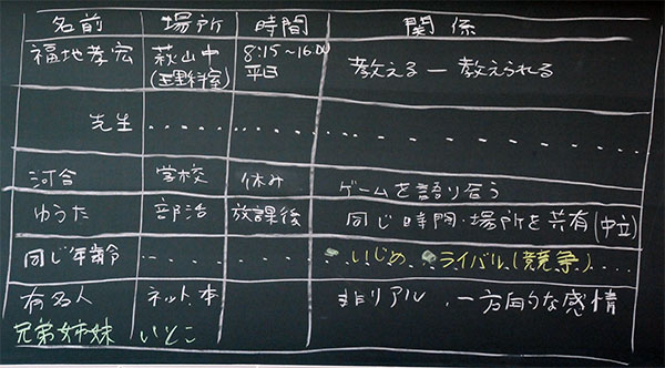 あなたが私と直接話したことがないなら、私との関係はweb上だけのことでしょう。あるいは自然界に見られない、かなり特殊なものです。関係している時間は、あなたがインターネットに接続したりページを読んだりしている時だけです。関係を持つかどうかは、あなたの意志に100%依存しています。場所は限定されていません。あなたは私に影響を与えることはできませんが、私はあなたに影響を与えています。ただし、私はあなたにどのような影響を与えたのかわかりません。あなたが幸せになることだけを願っているのですが、その結果を知るためにはあなたからの行動を待つしかありません。授業では、子どもたちに私との関係について教えました。場所は校内だけであること、時間は平日8時15分から16時までに限られていることです。子どもたちにとって、この事実確認は驚きだったと思います。そして、生徒-先生、という関係を確認します。