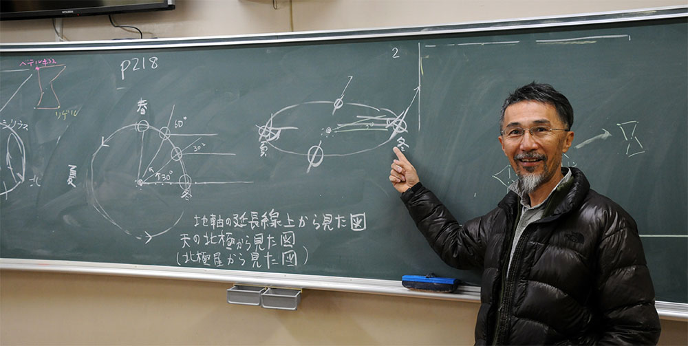 図4:私による補足説明(クリックすると拡大します)図4は問題集の解説スナップ写真です。黒板左の模式図は、天の北極から見た地球の公転を示しています。4つある地球は、30度ずつ動いています。この30度は、数学的に図4のように移動させることができます。また、私が指でさしている『冬の地球』と先の模式図の『冬の地球』は対応しています。私がさしている模式図は、天の北斜め上から見た図です。