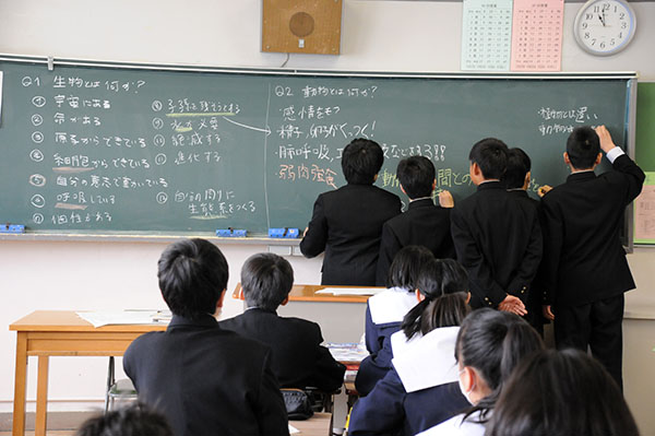 上:黒板左に、問い「生物とは何か?」に対する答えが書かれている。