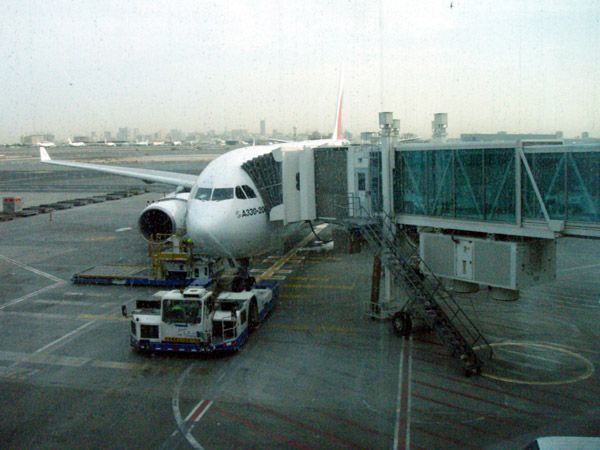 上:ボーディングブリッジを撮影。今度はタラップを使わず、待ち合いロビーから直接乗り込む。7:50 離陸