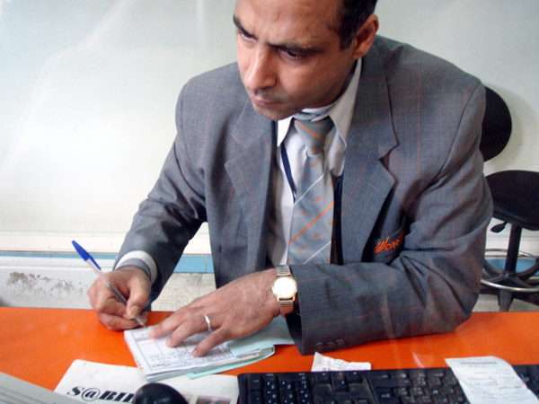 上:鉄道『カサブランカ駅』のチケット売り場の職員。通常はコンピューターを使って発券するが、私の場合、途中駅から座席を2等から1等に上げるので、手書きの処理となった。少々手間取ったが、事務処理能力は高い。16:30頃 カサブランカ発