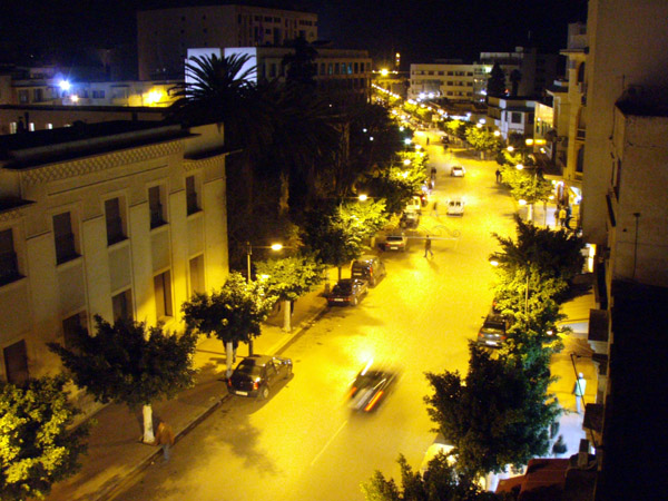 上:ホテルのテラスから撮影したメクネス新市街の様子(午後9時)。21:15 シャワー