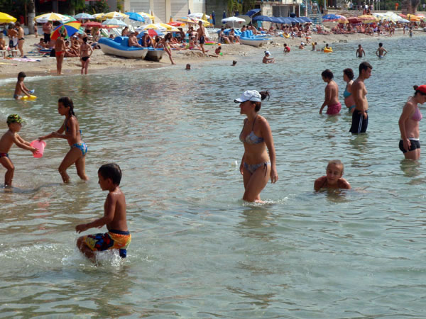 サランダの海で泳ぎました。ホテルのプールは海水が混じって少し塩からかったのですが、サランダの海は想像したほど辛くありませんでした。愛知県の内海海岸の1/4程度の辛さです。たっぷり泳ぐことはしませんでしたが、楽しく時間を過ごしました。ホテルの白いバスタオルを持って出かけました。