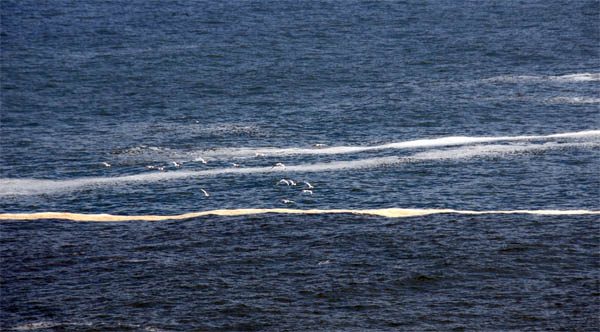 上:海上に浮かんでいるのは海底油田? (画面右端は海上風力発電2基)